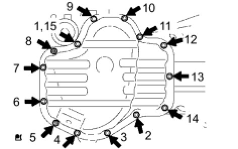 Uniformly tighten the 12 bolts and 2 nuts in the sequence shown in the illustration.