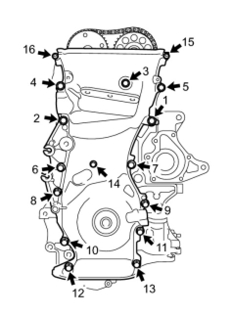 Temporarily tighten the timing chain cover with the 14 bolts and 2 nuts.