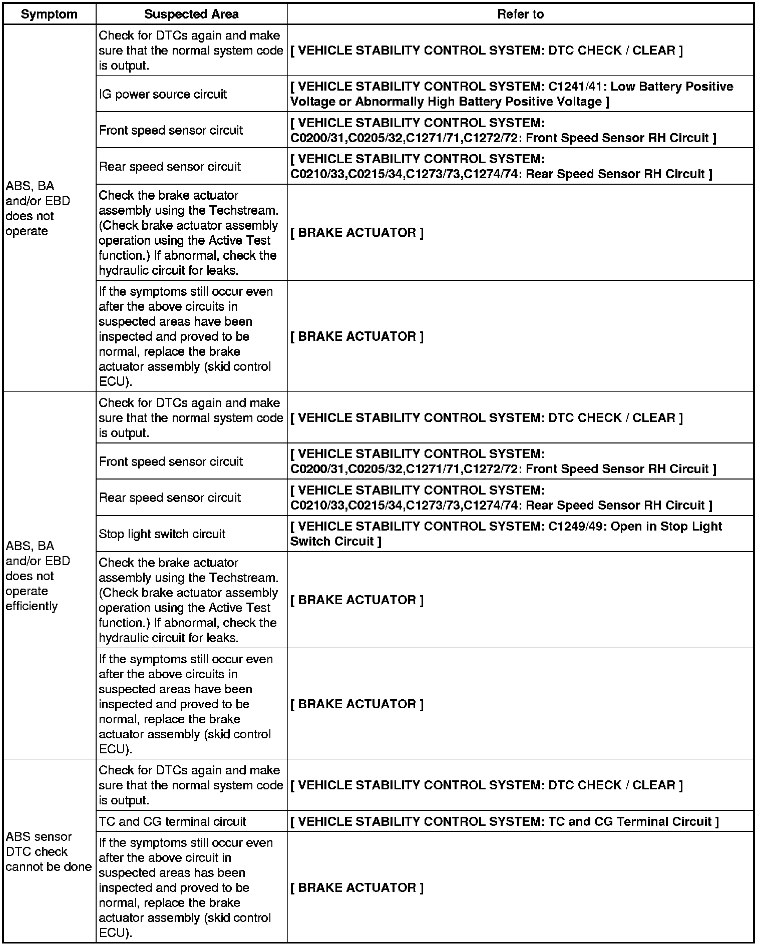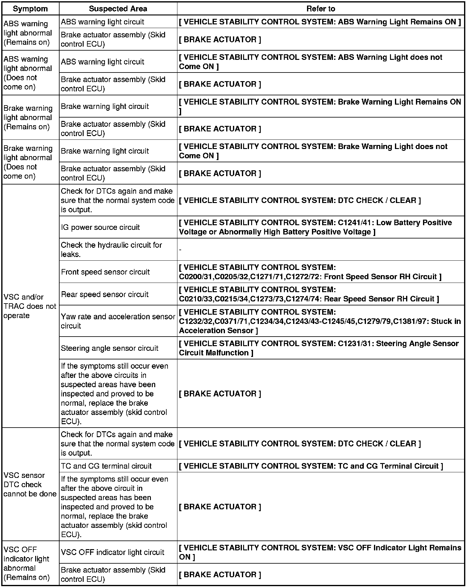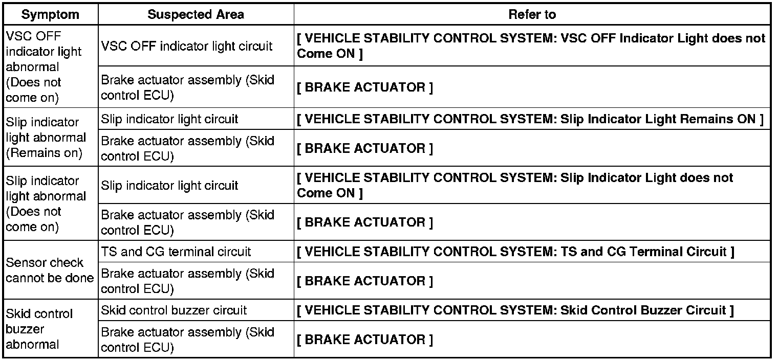 BRAKE CONTROL / DYNAMIC CONTROL SYSTEMS: VEHICLE STABILITY CONTROL SYSTEM: PROBLEM SYMPTOMS TABLE