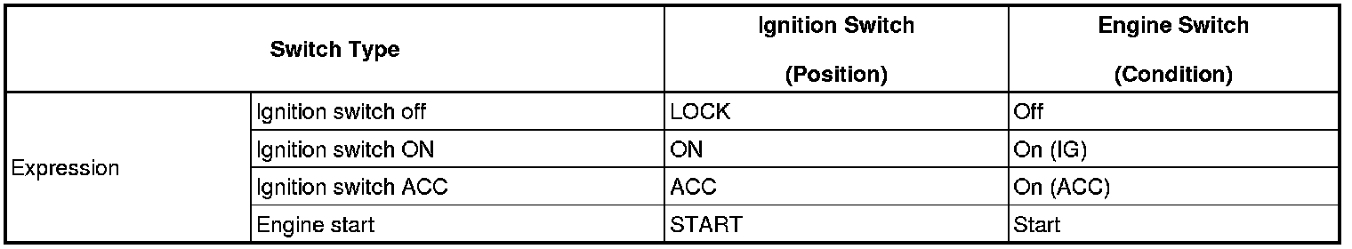 (a) The type of ignition switch used on this model differs according to the specifications of the vehicle. The expressions listed in the table below are used.