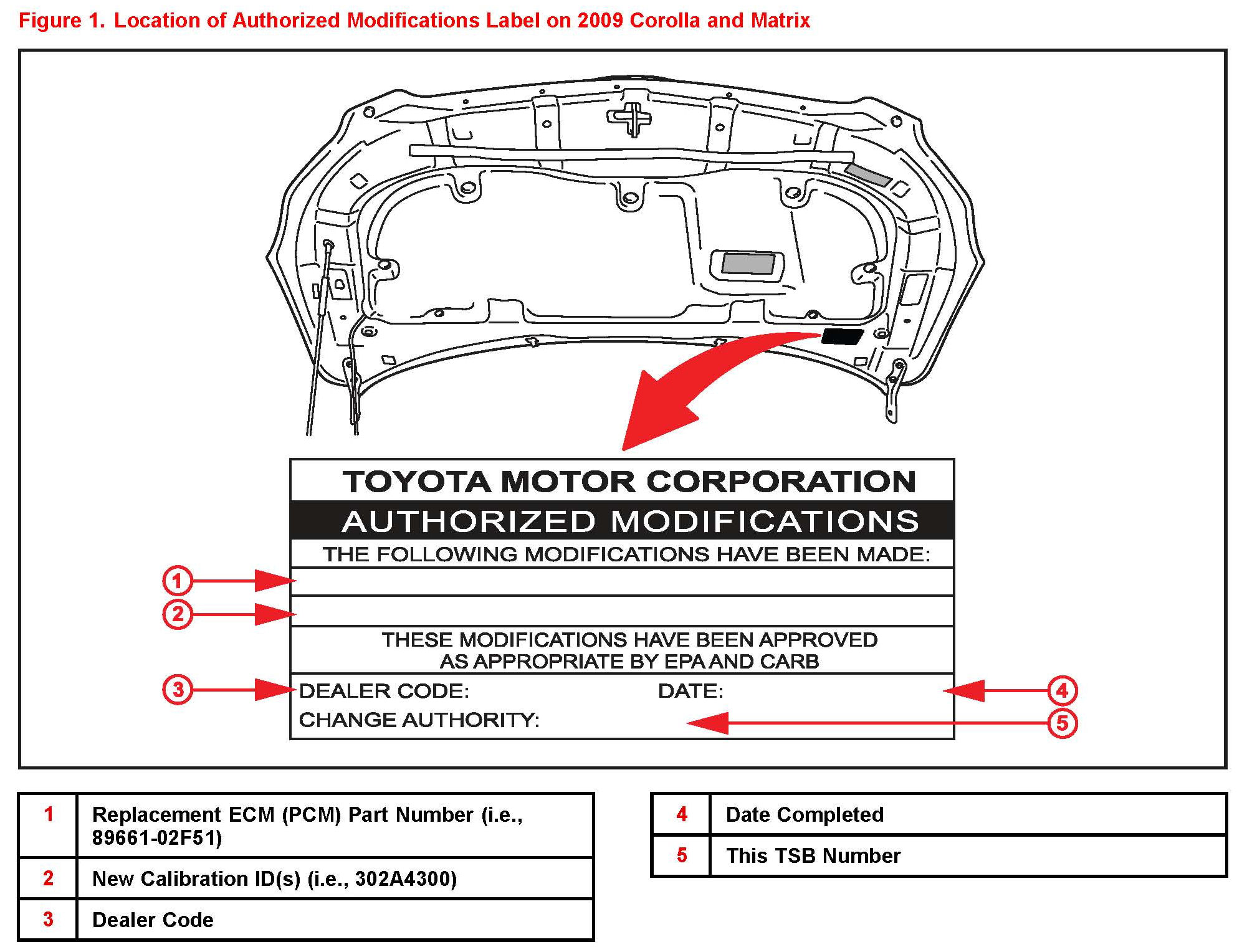 4. Check for the Authorized Modifications Label affixed to the vehicle in the location shown in Figure 1. Confirm if the ECM (PCM) calibration has been updated. If the calibration ID listed is NOT the latest ECM (PCM) calibration - go to step 5.