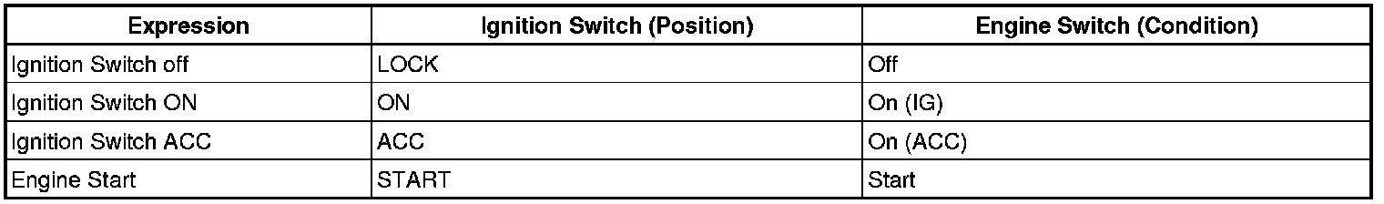 HINT: The type of ignition switch used on this model differs according to the specifications of the vehicle. The expressions listed in the table below are used.