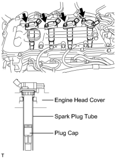 NOTE: When installing each ignition coil, do not damage the plug cap on the engine head cover opening or the upper edge of the spark plug tube.
