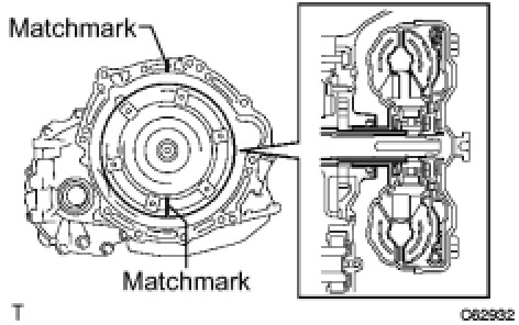 (d) Align the matchmarks on the case with the one on the converter and fit the spline of the input shaft to the spline of the turbine runner.