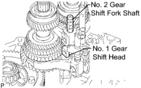 (b) Remove the No. 2 gear shift fork shaft and No. 1 gear shift head from the transaxle case.