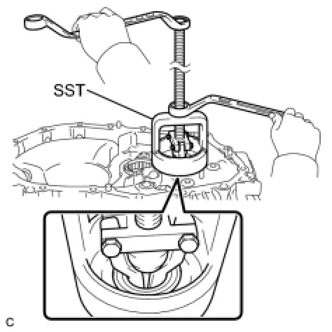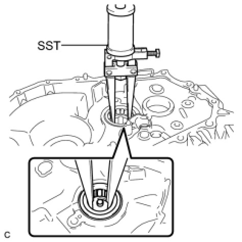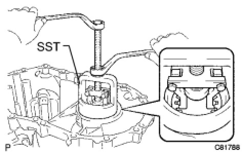 (a) Using SST, remove the front differential case rear tapered roller bearing (outer race) and plate washer from the transmission case.