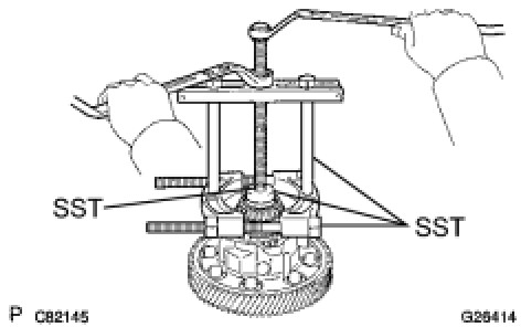 (b) Using SST, remove the front differential case rear tapered roller bearing (inner race) from the front differential case.