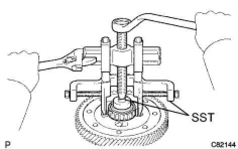 (a) Using SST, remove the front differential case front tapered roller bearing (outer race) and plate washer from the transaxle case.