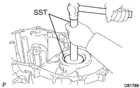 (a) Using SST and a hammer, remove the transaxle case oil seal from the transaxle case.