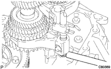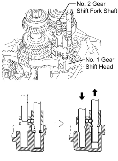 NOTE: To avoid interference from the 2 shift fork balls, lift up the No. 3 gear shift fork shaft to the position shown in the illustration.