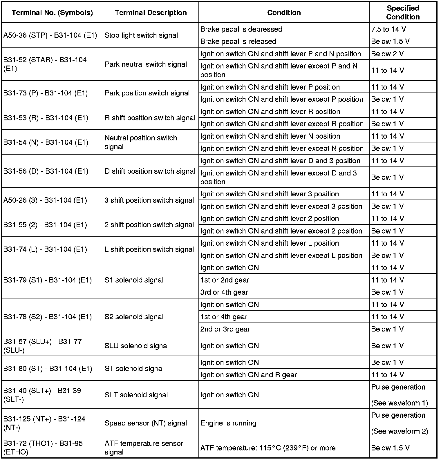 In the table, first follow the information under "Condition". Look under "Terminal No. (Symbols)" for the terminals to inspected. The standard voltage between the terminals is shown under "Specific Condition".