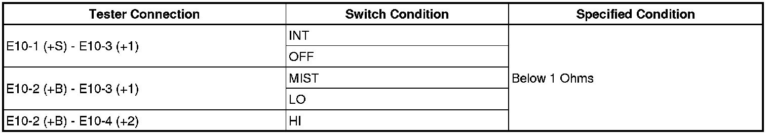 (5) Connect a battery negative (-) lead to terminal E10-1 (+S). Operate the intermittent wiper relay and check the voltage between terminals E10-3 (+1) and E9-2 (EW).