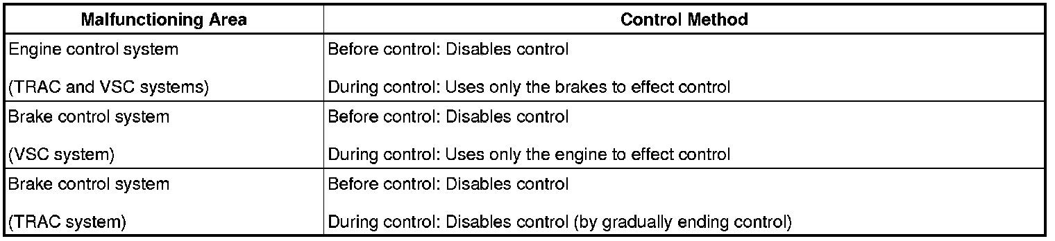 - If a VSC system component malfunctions before VSC control begins, VSC control will be prohibited. If a system component malfunctions during VSC control, the system will gradually stop performing the control so as not to trigger a sudden change in vehicle operation.