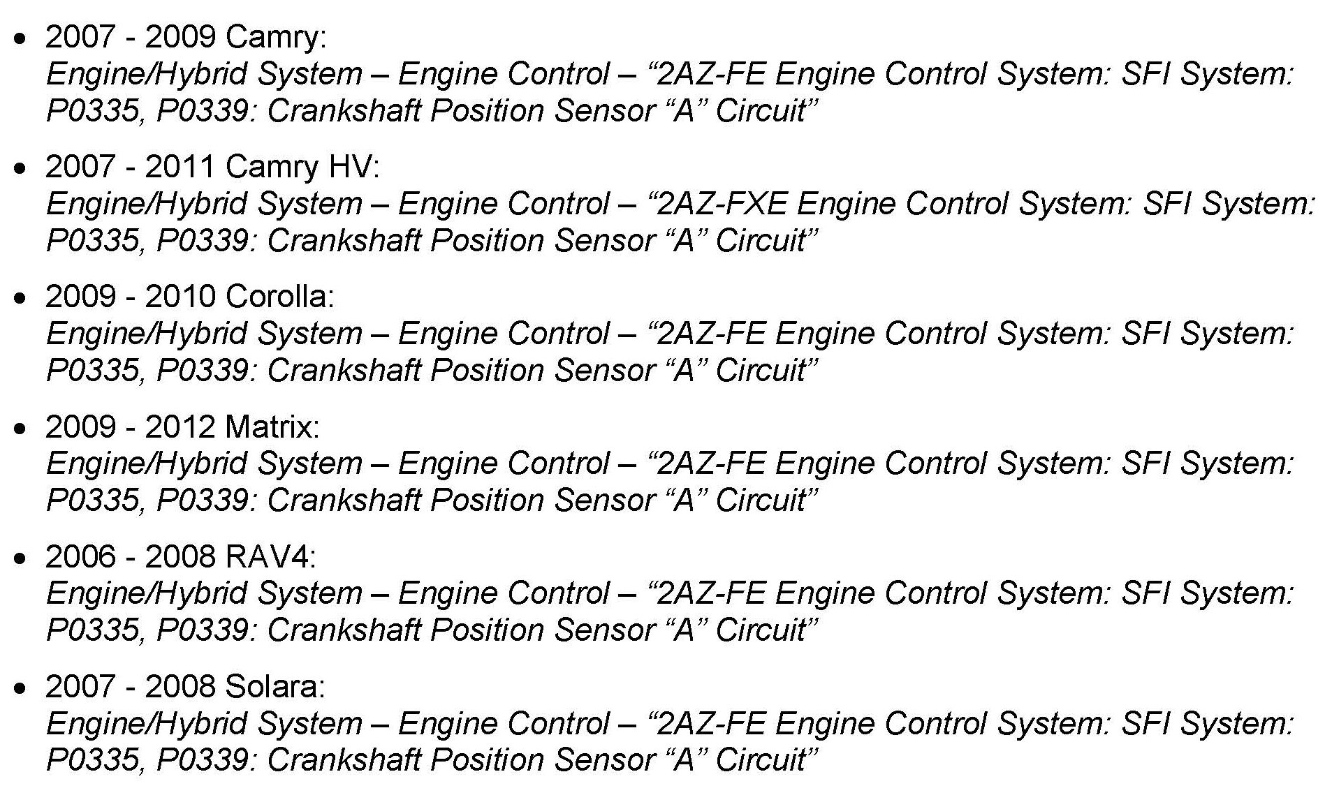 Some 2006 - 2012 model year vehicles equipped with the 2AZ-FE engine may exhibit an intermittent MIL "ON" condition with Diagnostic Trouble Code (DTC) P0335 (Crankshaft Position Sensor "A" Circuit) stored The intake camshaft gear assembly has been improved to help prevent this condition.