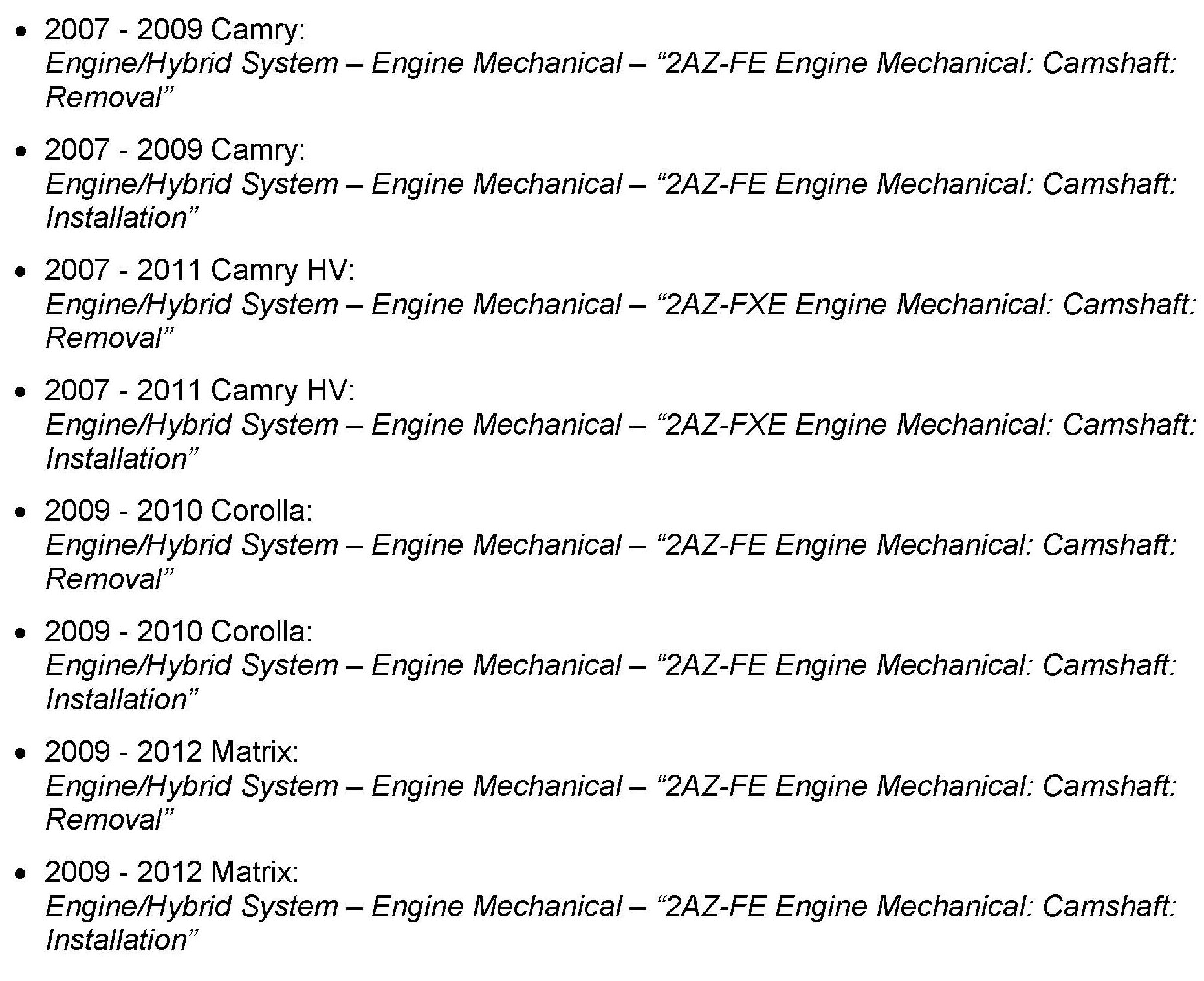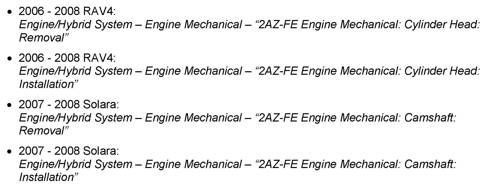 For RAV4 repairs refer to the Repair Manual procedure for 2007 Camry to simplify the repair instructions for camshaft removal instead of cylinder head removal.