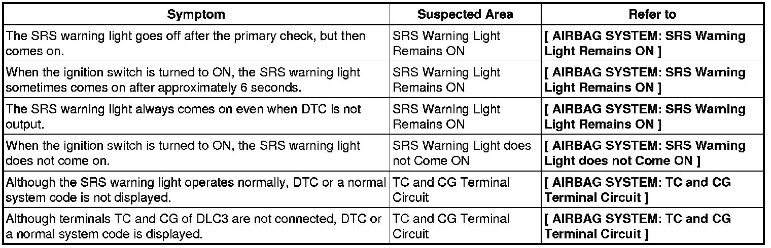 SUPPLEMENTAL RESTRAINT SYSTEMS: AIRBAG SYSTEM: PROBLEM SYMPTOMS TABLE