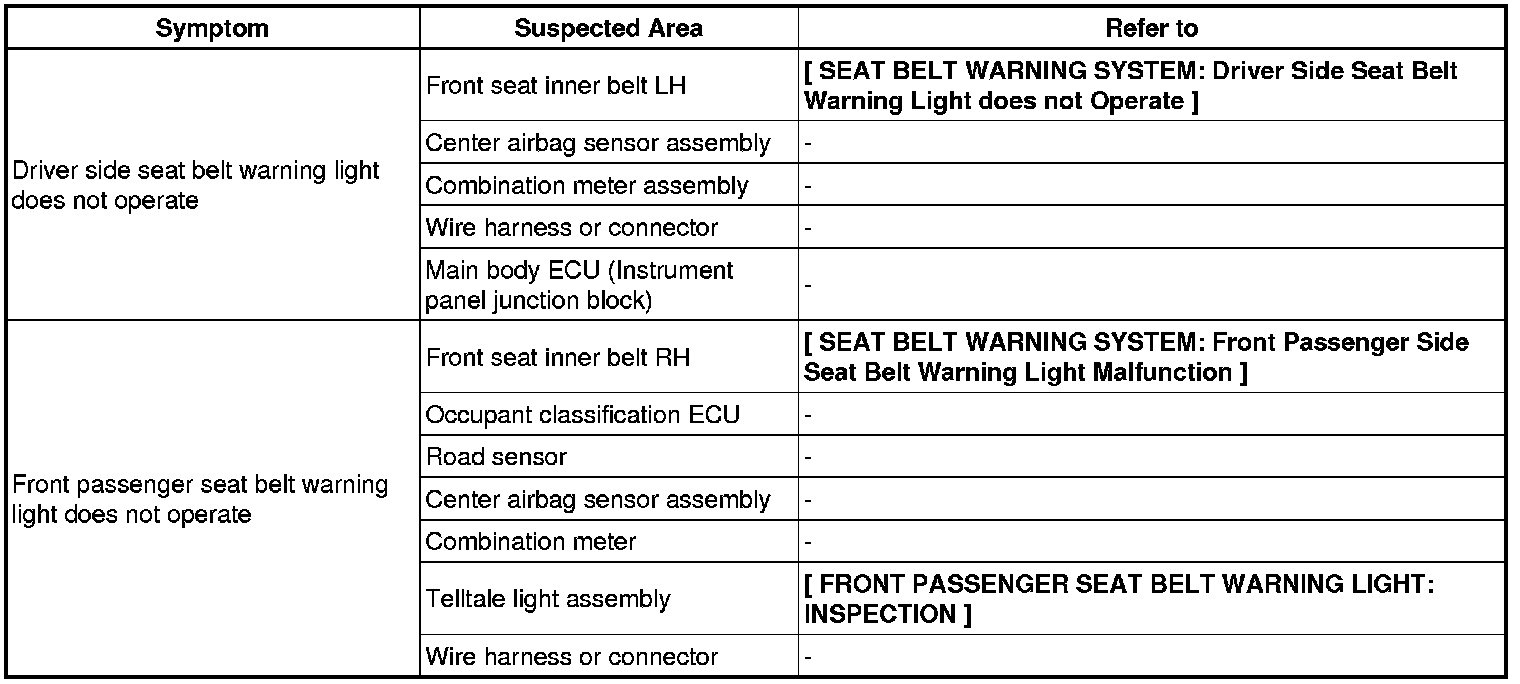 SEAT BELT: SEAT BELT WARNING SYSTEM: PROBLEM SYMPTOMS TABLE