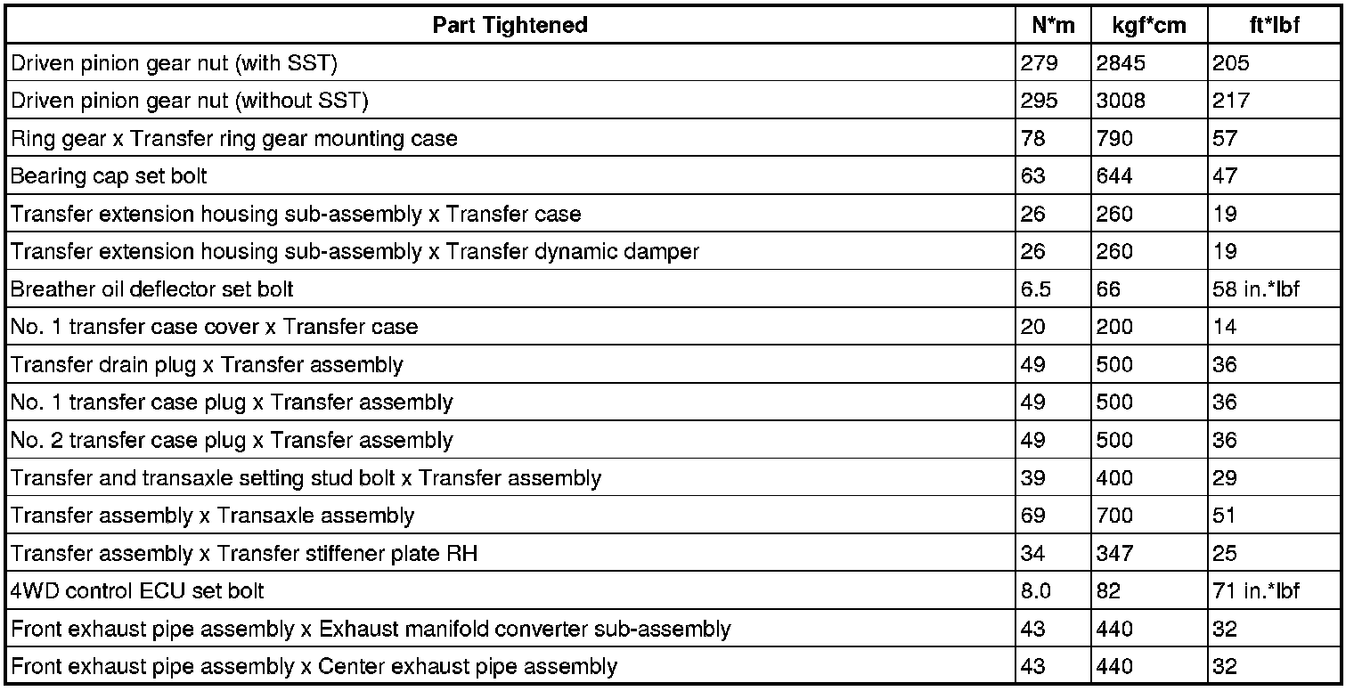 SPECIFICATIONS: MF1A TRANSFER / 4WD / AWD: TORQUE SPECIFICATIONS