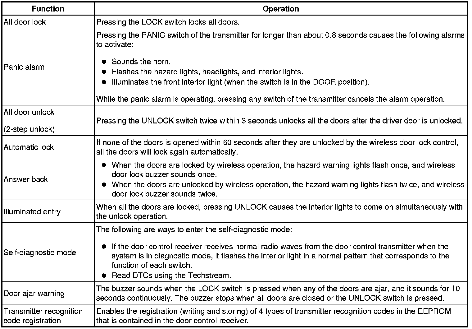The door control transmitter has LOCK, UNLOCK and PANIC switches. Operating these switches activates each function.