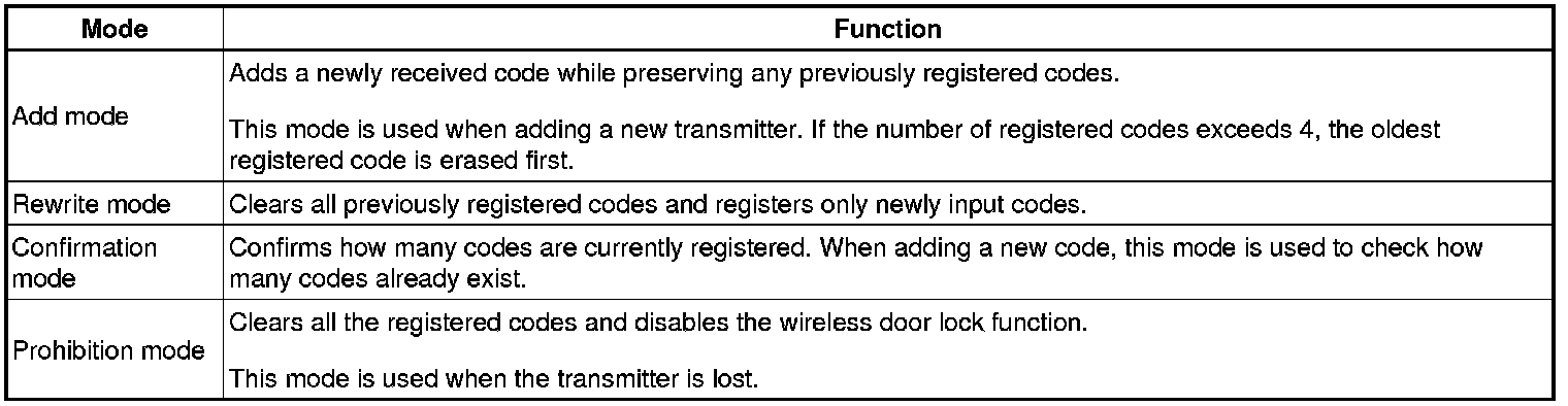 The table below shows the 4 ID registration function modes by which up to 4 different codes can be registered. The codes are electronically registered (written and stored) in the EEPROM that is contained in the door control receiver.