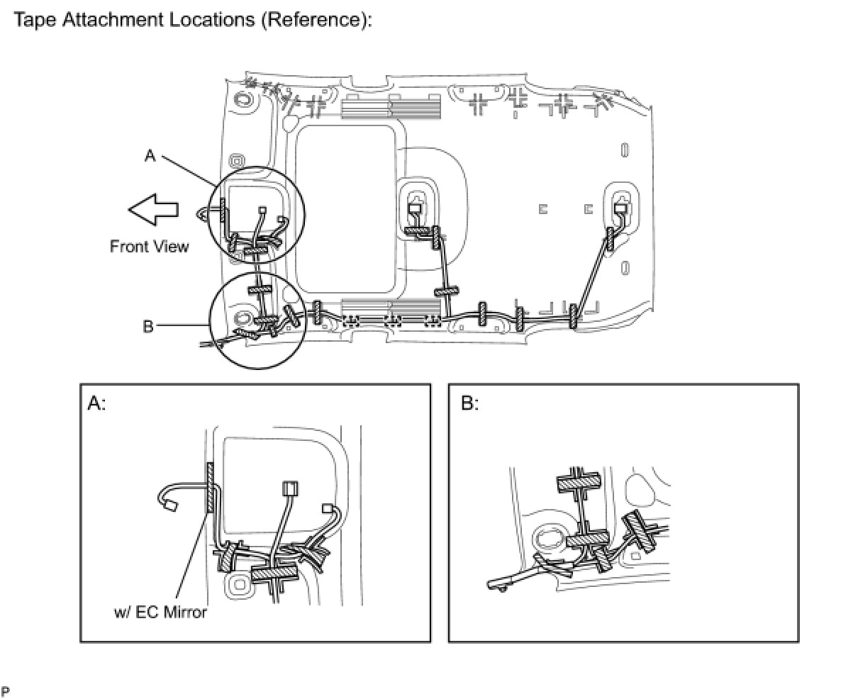 HINT: As shown in the illustration, line up and secure the reference tape of the wire harness to the tip of the roof headlining assembly.