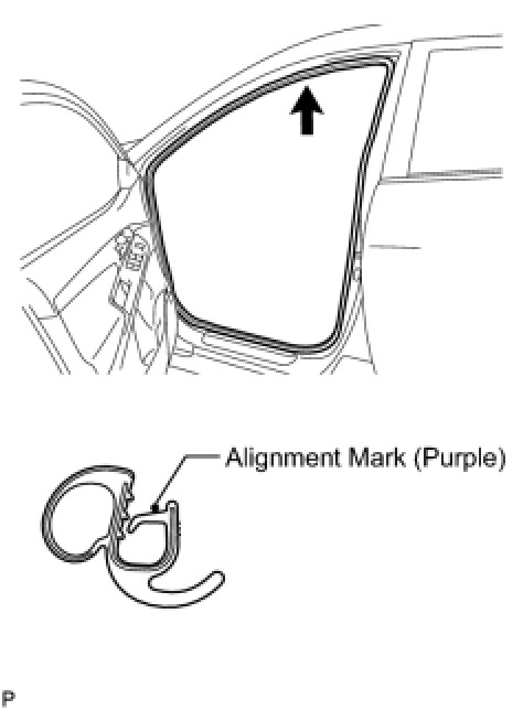 (a) Align the alignment mark (purple) on the weatherstrip with the protruding portion on the body indicated by the arrow in the illustration, and install the front door opening trim weatherstrip LH.