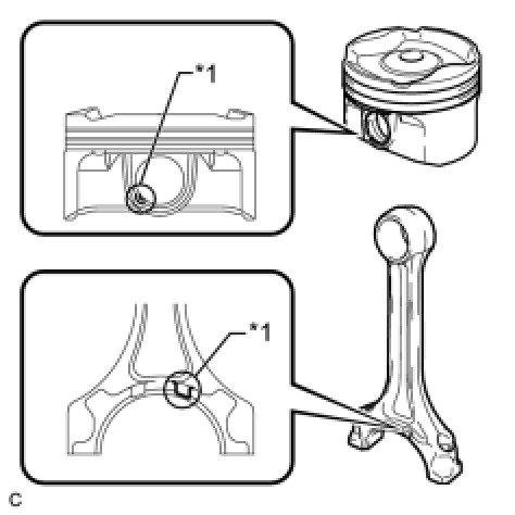 (d) Align the front marks of the piston and connecting rod, insert the connecting rod into the piston, and then push in the piston pin with your thumb until the pin comes into contact with the snap ring.