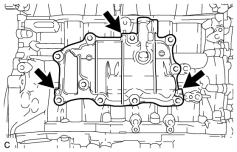 (b) Using a screwdriver, remove the stiffening crankcase by prying between the stiffening crankcase and cylinder block at the places shown in the illustration.