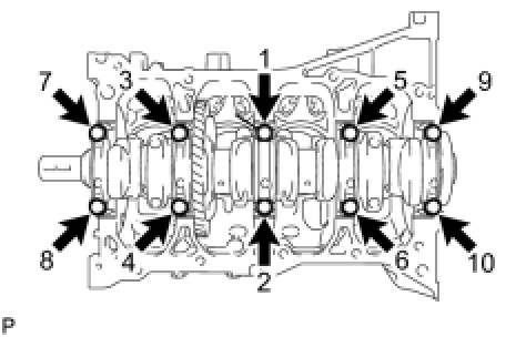 Using several steps, uniformly install and tighten the 10 bearing cap bolts in the sequence shown in the illustration.
