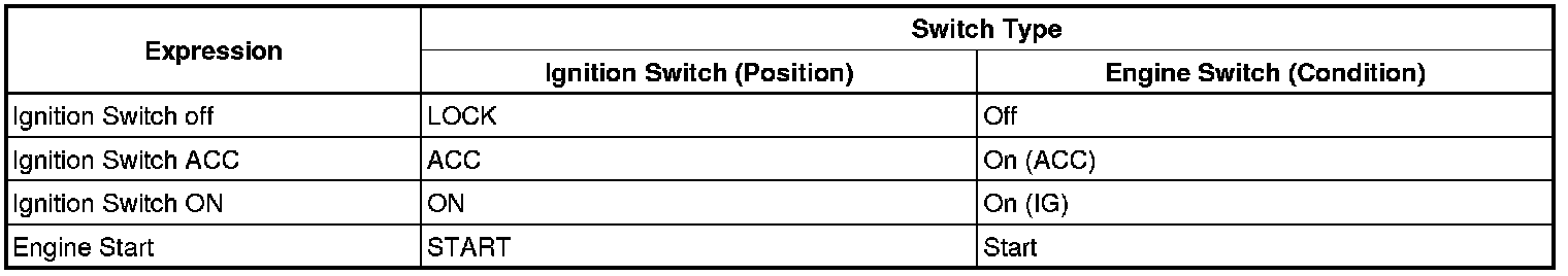 HINT: The type of ignition switch used on this model differs according to the specifications of the vehicle. The expressions listed in the table below are used in this section.
