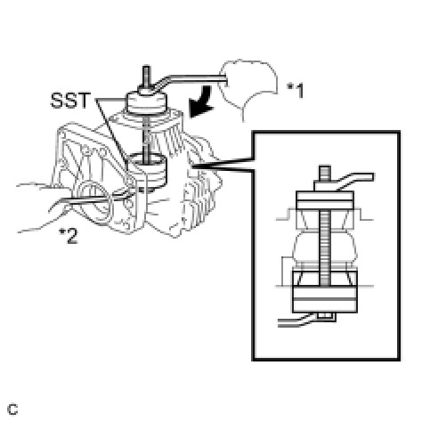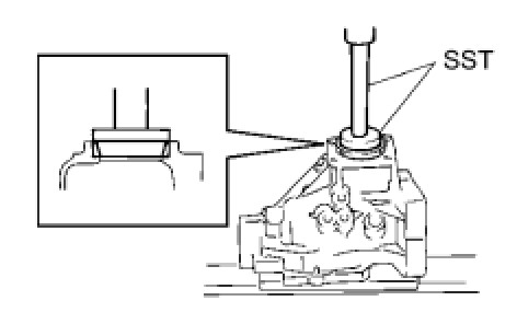 (f) Using SST and a press, press the ring gear mounting case bearing (outer race) into the transfer case.