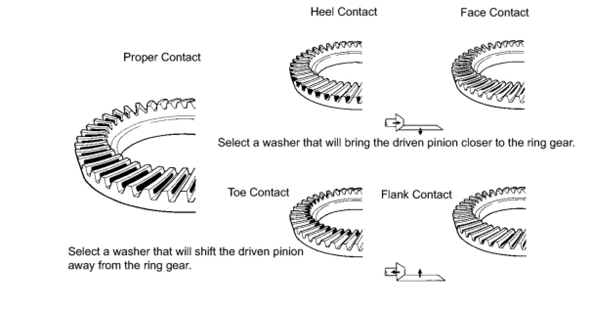 (d) If the tooth contact pattern is not correct, select a new transfer output shaft washer that is thicker or thinner as necessary and recheck.