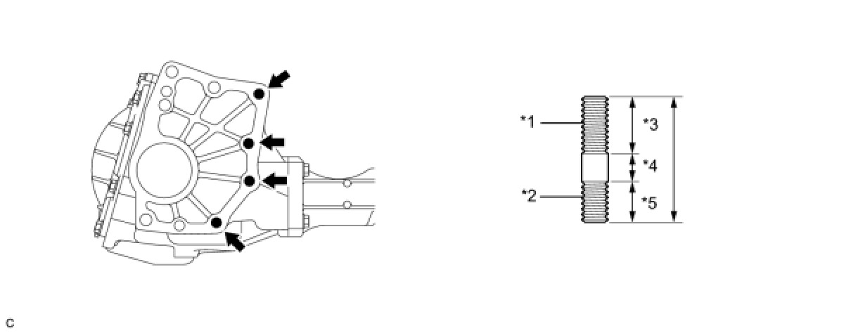 (a) Install the new 4 transfer and transaxle setting stud bolts to the transfer case positions shown in the illustration.