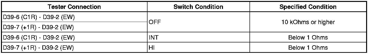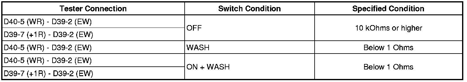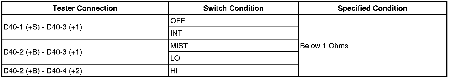 (5) Connect a battery negative (-) lead to terminal D40-1 (+S). Operate the intermittent wiper relay and check the voltage between terminals D40-3 (+1) and D39-2 (EW).