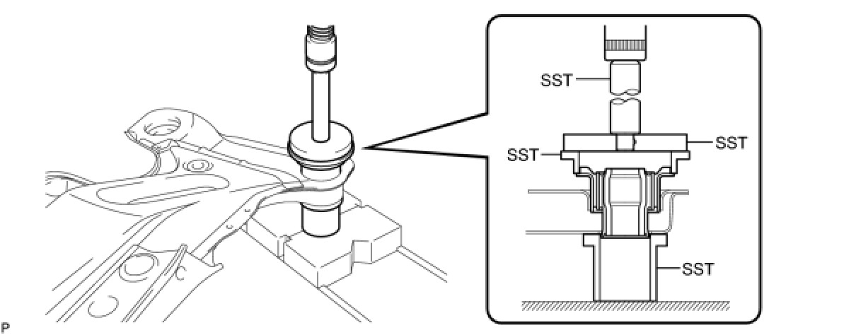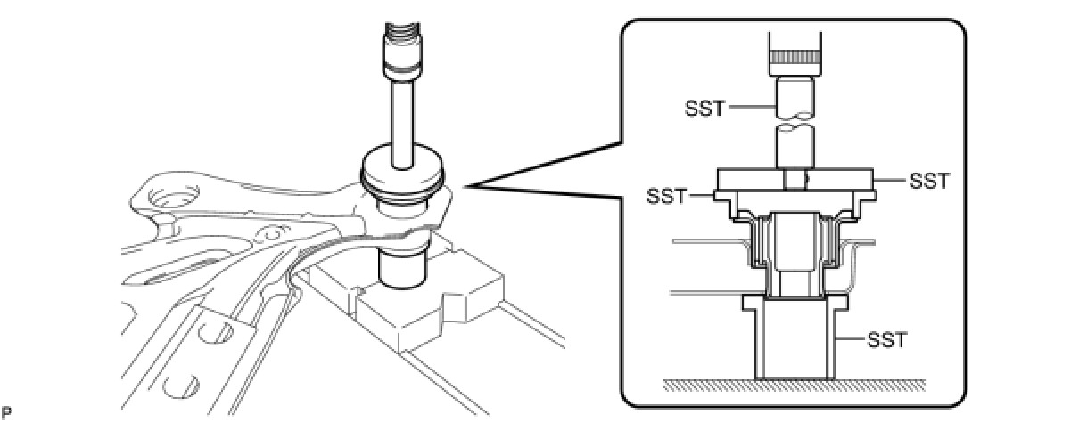 (b) Using SST and a press, install the rear suspension member body mounting rear cushion (LH side) to the rear suspension member sub-assembly.