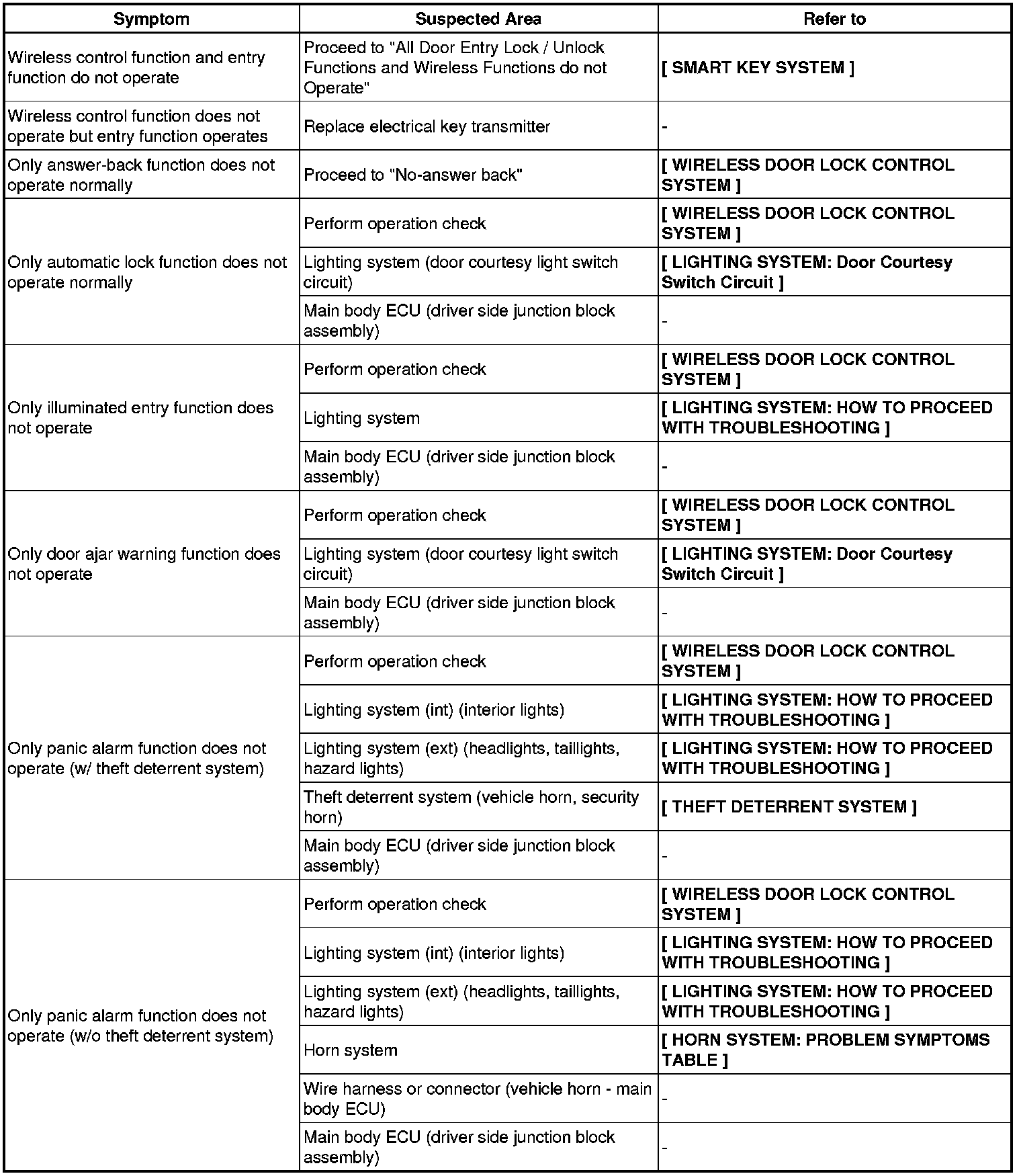 DOOR LOCK: WIRELESS DOOR LOCK CONTROL SYSTEM (w/ Smart Key System): PROBLEM SYMPTOMS TABLE