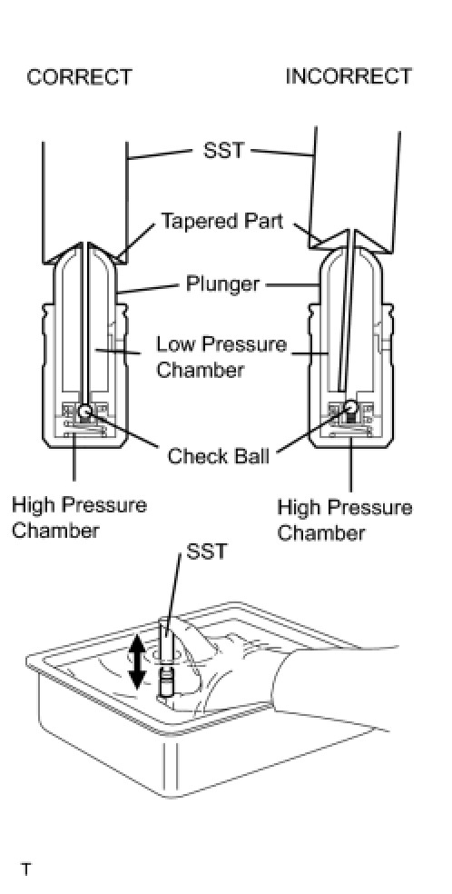 NOTICE: When bleeding air from the high-pressure chamber, make sure that the tip of SST is actually pressing the check ball as shown in the illustration. If the check ball is not pressed, air will not bleed.