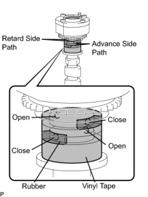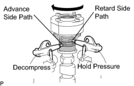 (4) Check that the camshaft timing gear assembly rotates in the advance direction when reducing the air pressure applied to the retard side path.