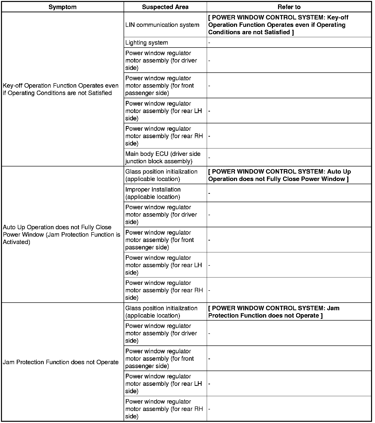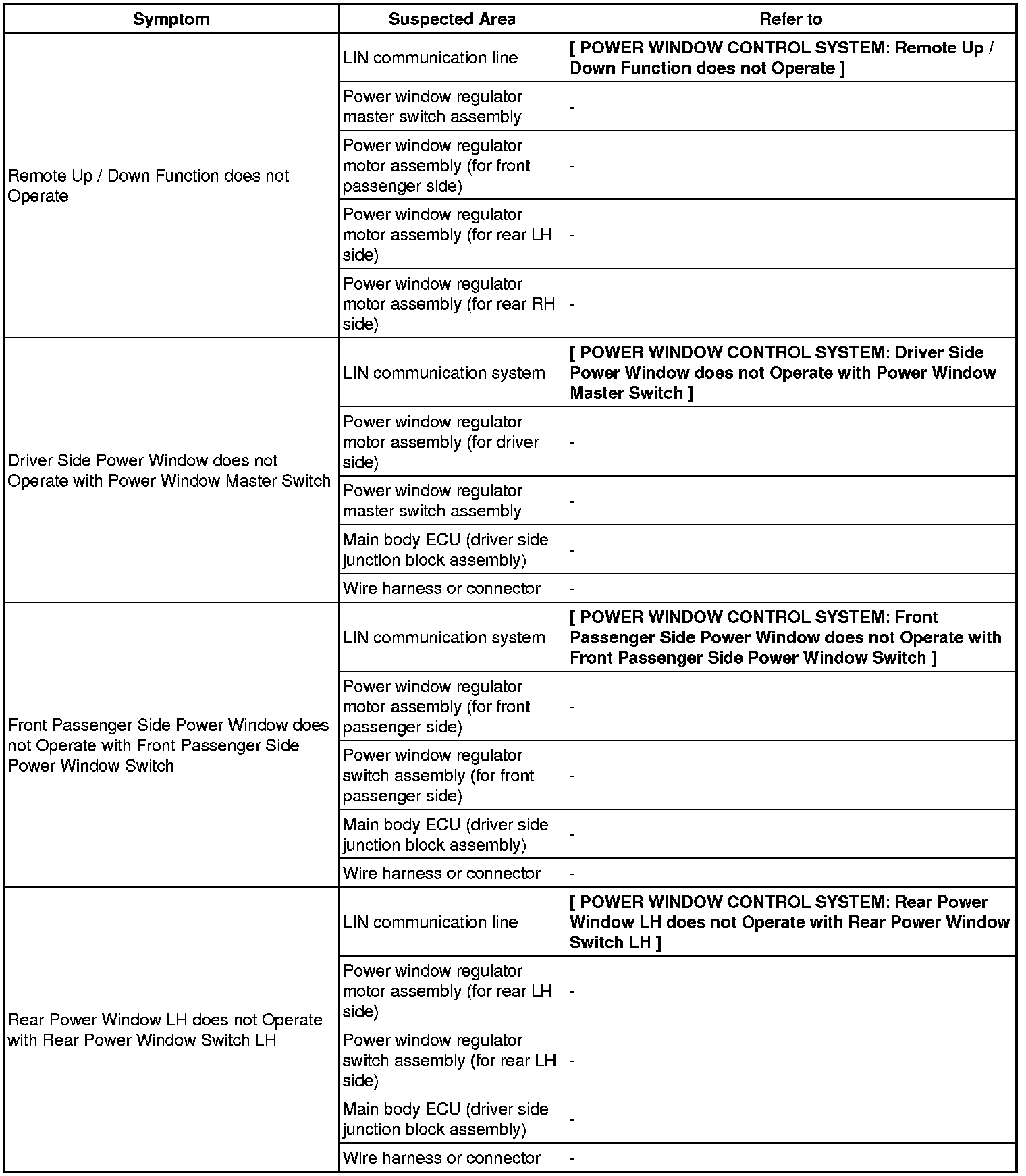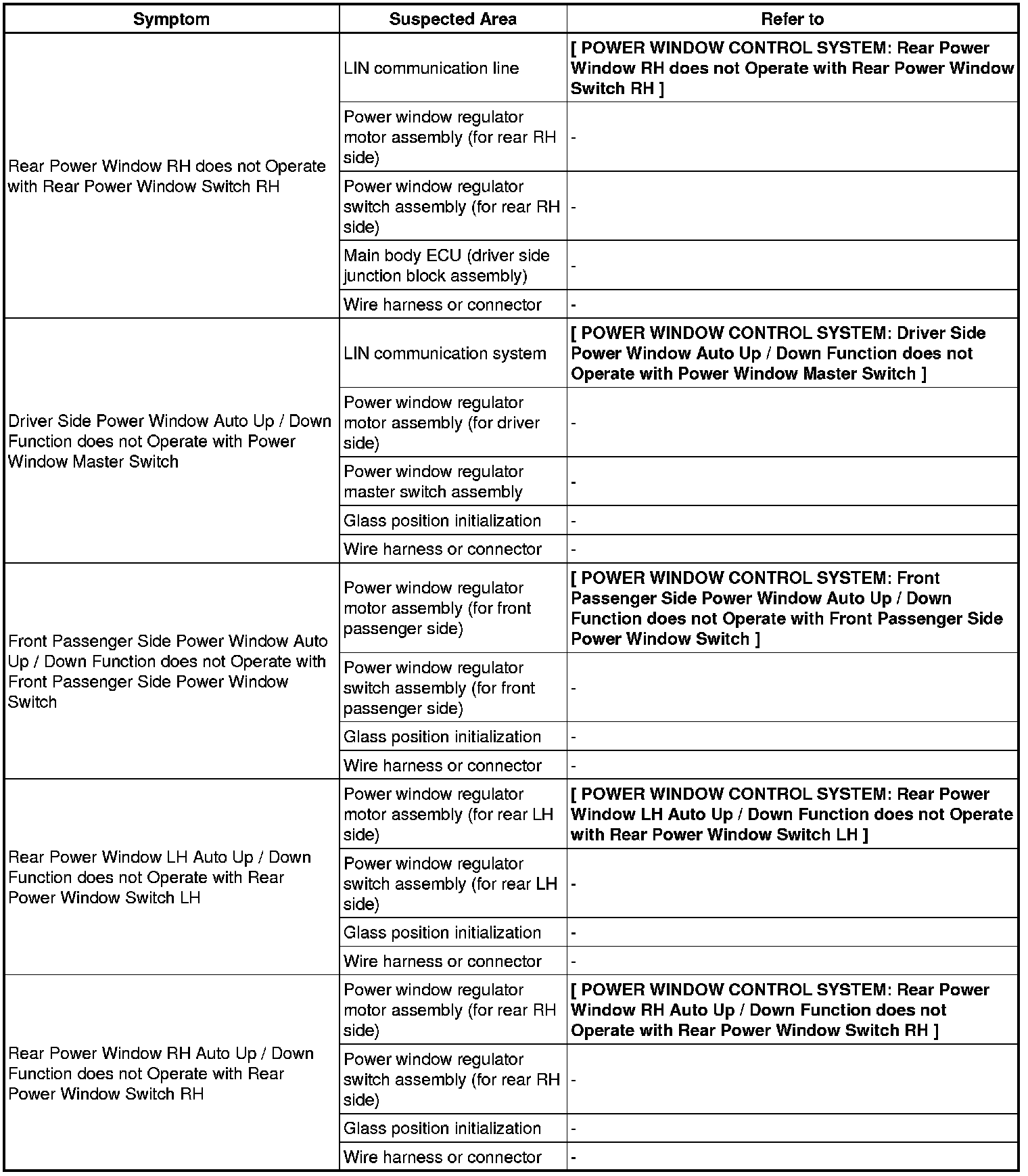 WINDOW / GLASS: POWER WINDOW CONTROL SYSTEM: PROBLEM SYMPTOMS TABLE