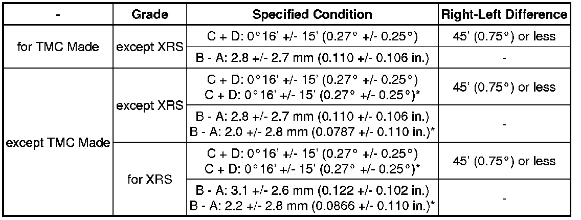 If the toe-in is not within the specified range, inspect the suspension parts and replace them if necessary.