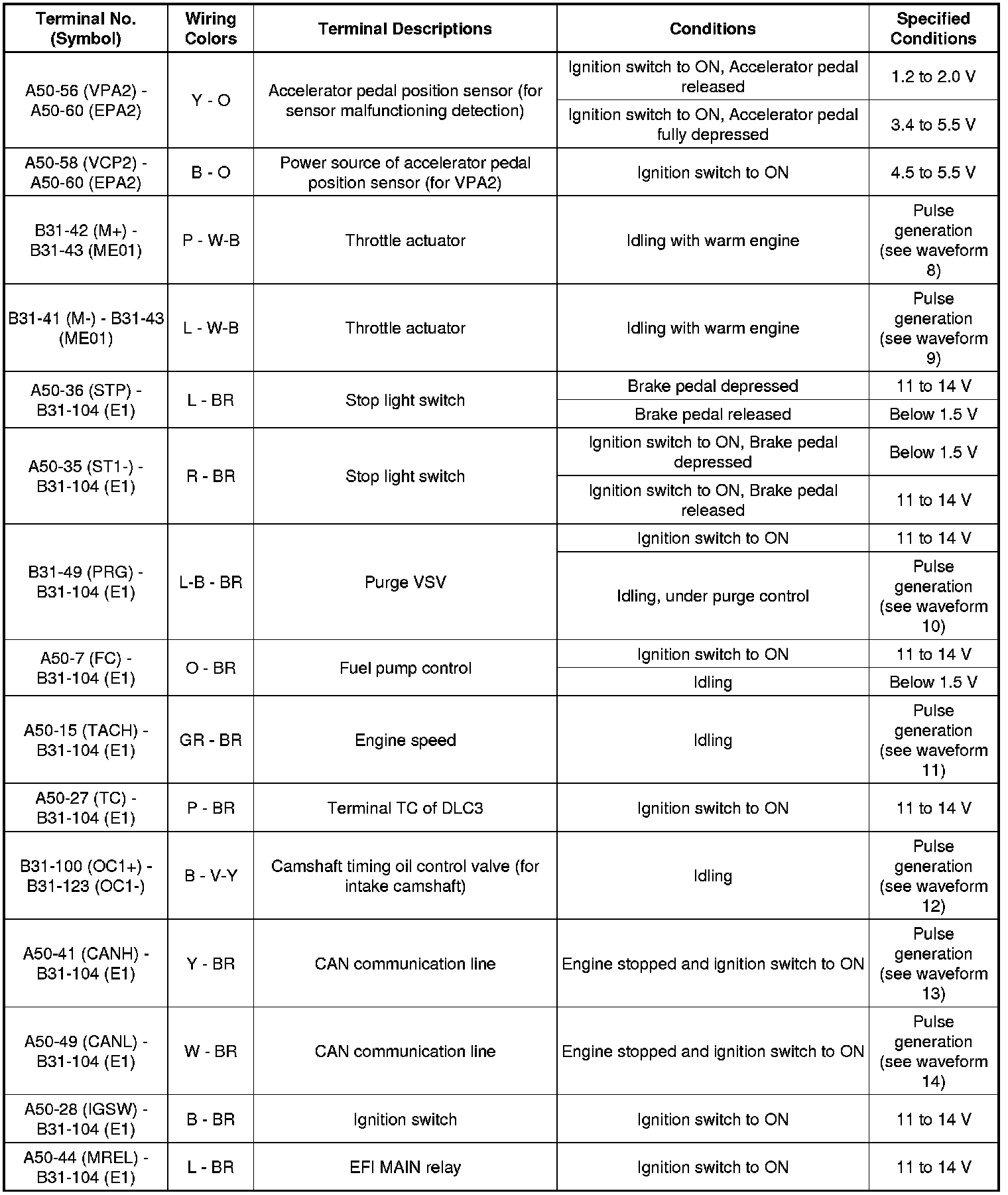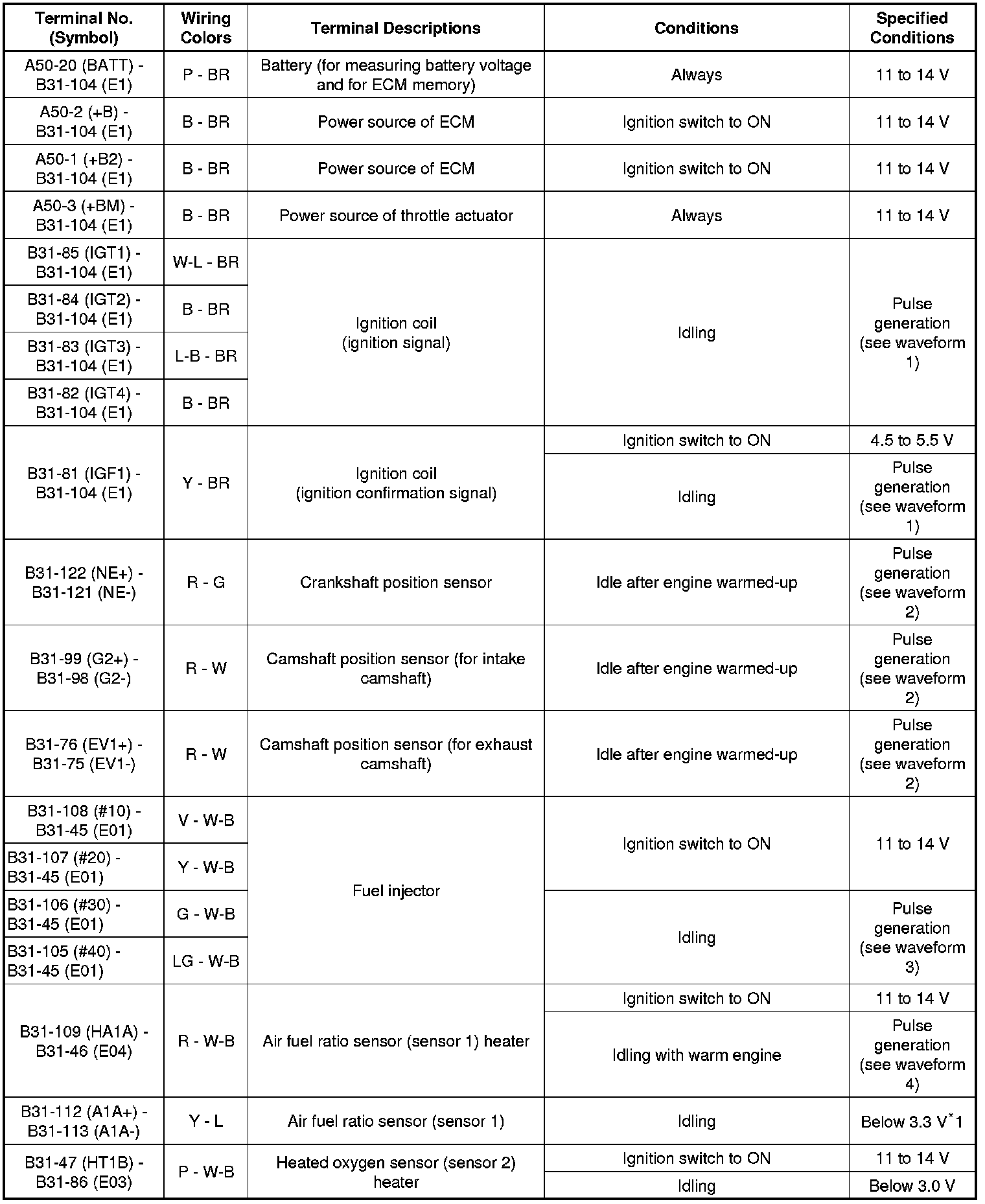 The standard normal voltage between each pair of the ECM terminals is shown in the table below. The appropriate conditions for checking each pair of the terminals are also indicated. The result of checks should be compared with the standard normal voltage for that pair of the terminals, and displayed in the "Specified Conditions" column. The illustration above can be used as a reference to identify the ECM terminal locations.