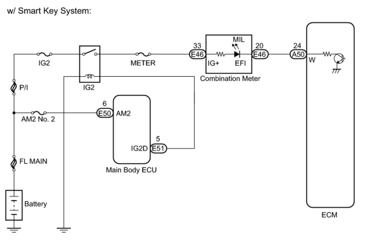 The MIL (Malfunction Indicator Lamp) is used to indicate vehicle malfunction detected by the ECM. When the ignition switch is turned to ON, power is supplied to the MIL circuit, and the ECM provides the circuit ground which illuminates the MIL.