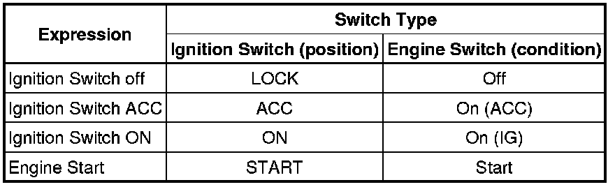 The type of ignition switch used on this model differs according to the specifications of the vehicle. The expressions listed in the table below are used in this section.