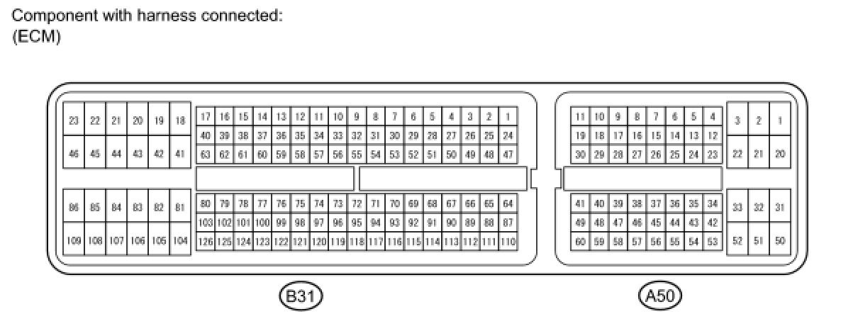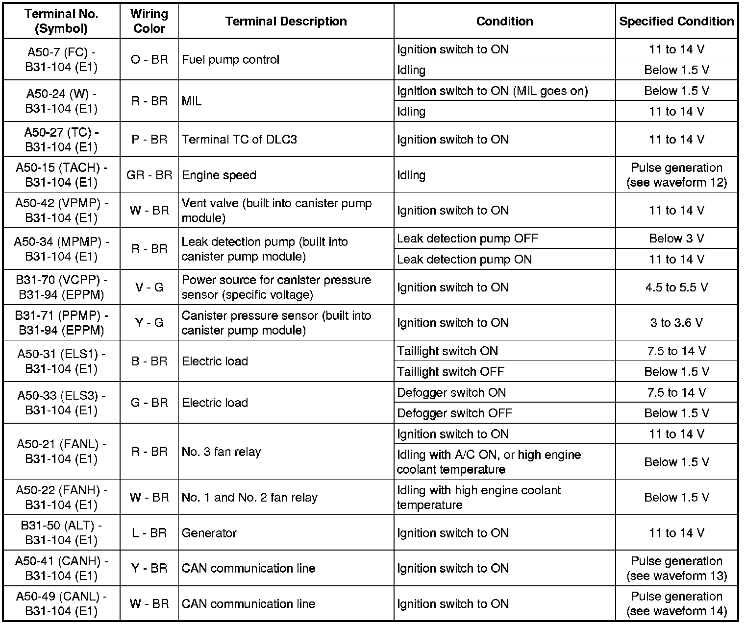 The standard normal voltage between each pair of ECM terminals is shown in the table below. The appropriate conditions for checking each pair of terminals are also indicated. The result of checks should be compared with the standard normal voltage for that pair of terminals, displayed in the Specified Condition column. The illustration above can be used as a reference to identify the ECM terminal locations.