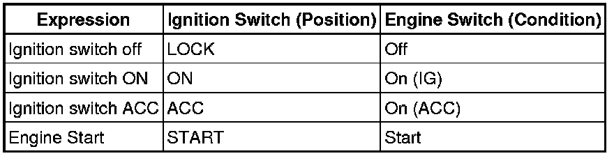 The type of ignition switch used on this model differs according to the specifications of the vehicle. The expressions listed in the table below are used in this section.