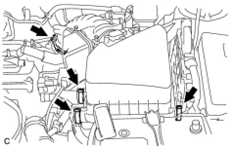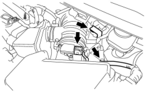 (e) Connect the 2 wire harness clamps and the mass air flow meter connector.