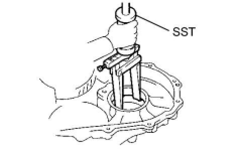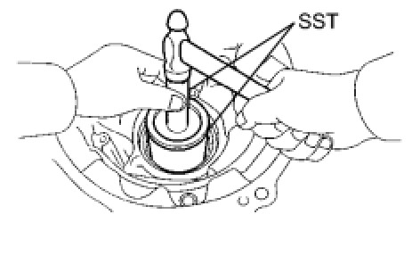 (b) Using SST, remove the front differential case front tapered roller bearing outer race.