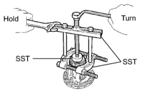 (a) Using SST, remove the front differential case rear tapered roller bearing from the differential case.
