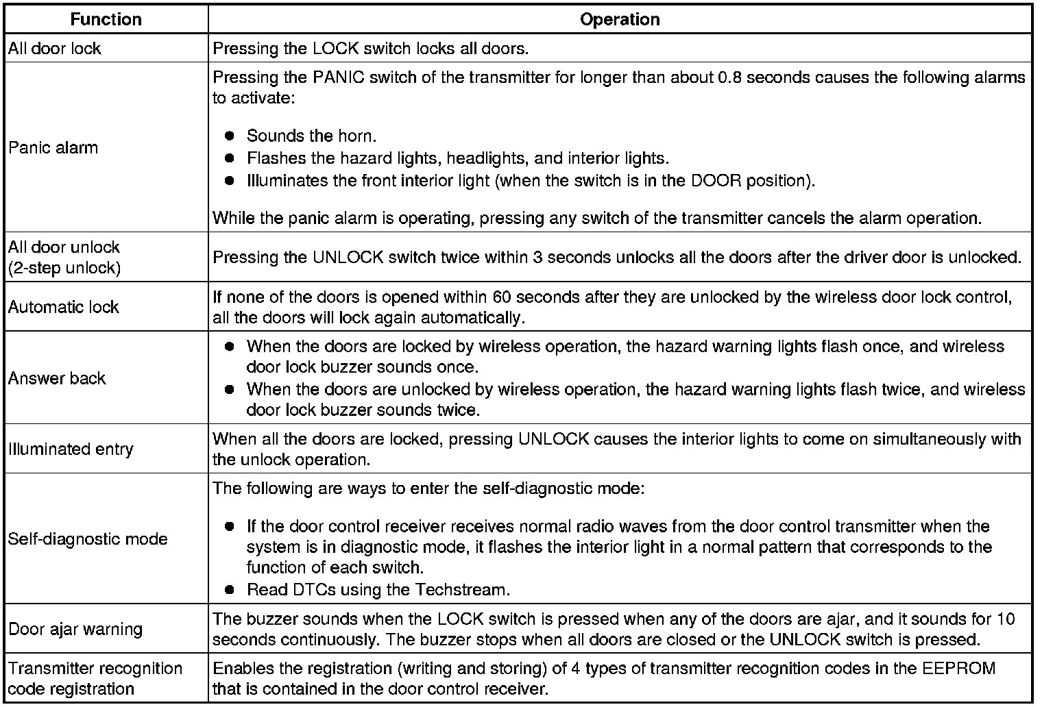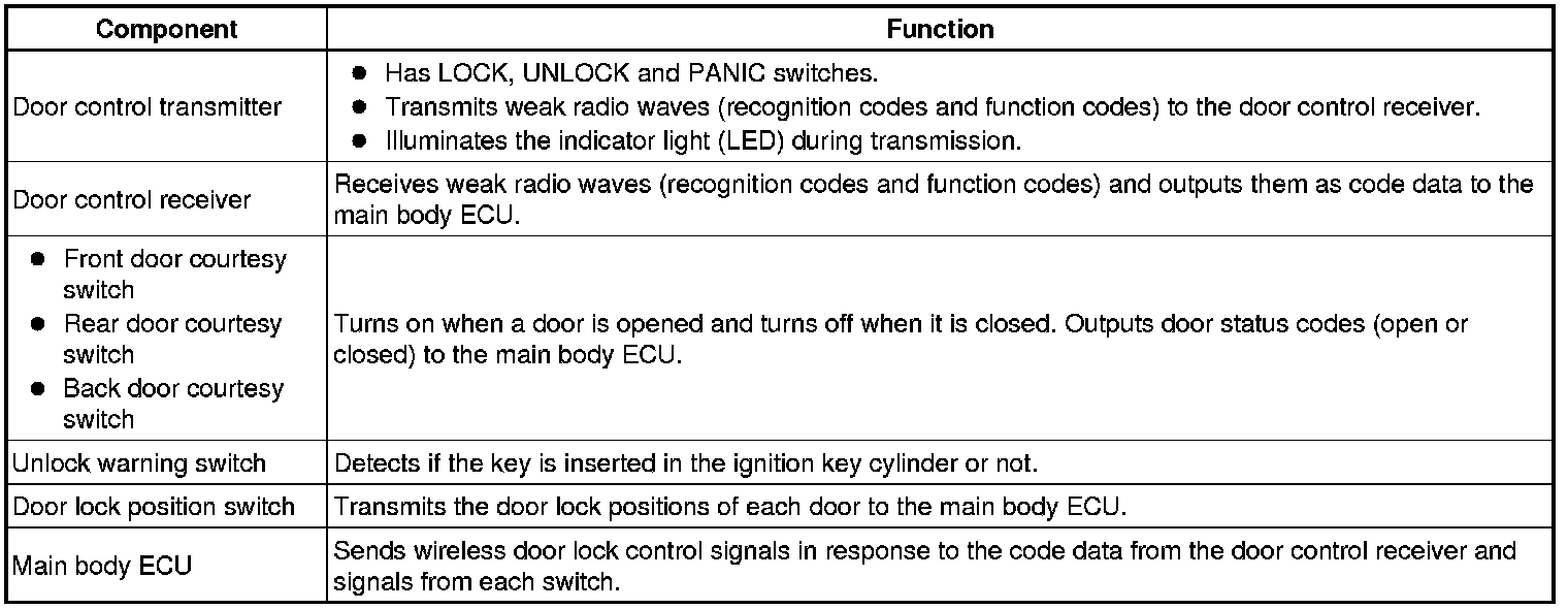 The wireless door lock control system functions to lock and unlock all the doors from a distance. The system is controlled by a hand-held transmitter which sends radio waves to the door control receiver. The main body ECU performs an ID code identification process and engages the door lock control.