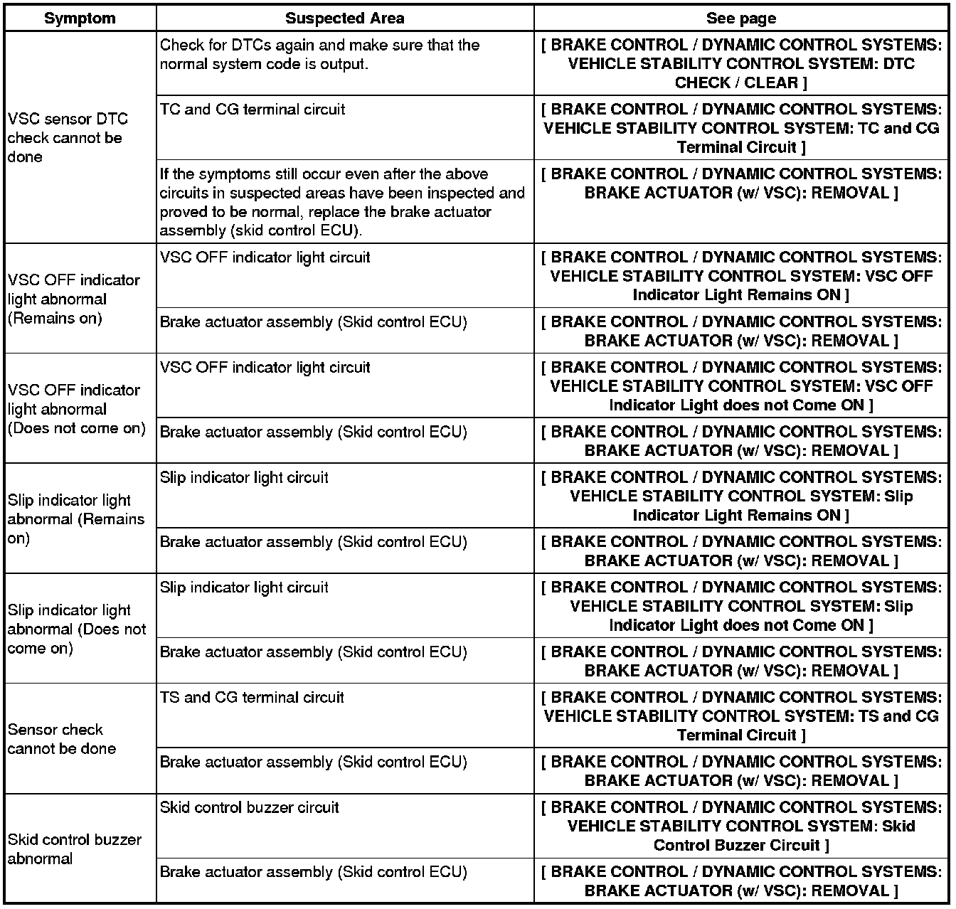 BRAKE CONTROL / DYNAMIC CONTROL SYSTEMS: VEHICLE STABILITY CONTROL SYSTEM (for 2ZR-FE): PROBLEM SYMPTOMS TABLE